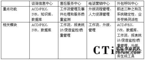 下面我們以圖表的形式給出上述四種呼叫中心的重點功能需求:
