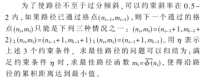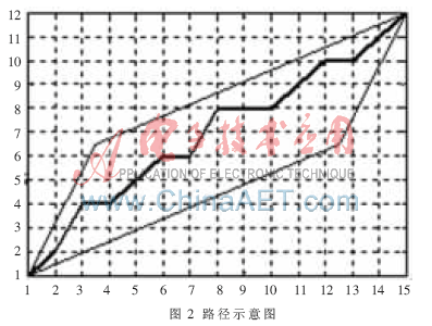 把測(cè)試模版的各個(gè)幀號(hào)n=1,…,N在一個(gè)二維直角坐標(biāo)系的橫軸上標(biāo)出,把參考模版的各幀號(hào)m=1,…,M在縱軸上標(biāo)出,通過(guò)這些表示幀號(hào)的整數(shù)坐標(biāo)畫(huà)出的橫縱線(xiàn)即可形成一個(gè)網(wǎng)格,網(wǎng)格中的每一個(gè)交叉點(diǎn)(n,m)表示測(cè)試模版中某一幀與訓(xùn)練模版中某一幀的交叉點(diǎn)。動(dòng)態(tài)規(guī)劃算法可以歸結(jié)為尋找一條通過(guò)此網(wǎng)格中若干格點(diǎn)的路徑,路徑通過(guò)的格點(diǎn)即為測(cè)試和參考模版中距離計(jì)算的幀號(hào)。