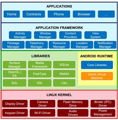 系統(tǒng)函式庫(Library):使用C/C++函式庫的系統(tǒng)組件以供呼叫使用,開發(fā)者可透過上層的應(yīng)用程序框架來運用這些功能,這也是主要Android設(shè)備的效能關(guān)鍵。