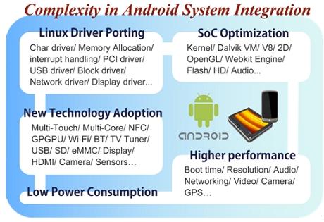 對廠商而言,開發(fā)一款A(yù)ndroid設(shè)備,不僅僅只是將所有零組件組合成為一個產(chǎn)品那么容易,最大的學(xué)問便在于將系統(tǒng)單芯片(System-on-a-chip,SoC)、各種新技術(shù)和Android系統(tǒng)進(jìn)行整合,SoC涉及像是Dalvik Virtual Machine、OpenGL、V8、Webkit Engine等上層的演算,與Android間的結(jié)合便必須透過不斷的嘗試與驗證,才能研發(fā)出既符合成本效益、又有良好效能的優(yōu)化產(chǎn)品。目前市面上有些SoC廠商已針對Android系統(tǒng)的特性,提供整合過的SoC平臺,將藍(lán)牙、相機(jī)或上網(wǎng)等常用功能模組預(yù)先寫入,減少終端成品廠商費力整合開發(fā)的時間,但對廠商而言,這樣的預(yù)先整合是否適合自身產(chǎn)品,以及是否需要再作更細(xì)致的修改,則又是更困難的課題。