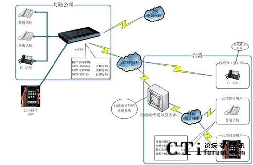  “兩岸通”利用最新的VOIP技術(shù),實現(xiàn)大陸固話辦公電話系統(tǒng)通過互聯(lián)網(wǎng)遠程連接到臺灣的電話系統(tǒng),實現(xiàn)兩岸低資費甚至零資費電話互打。