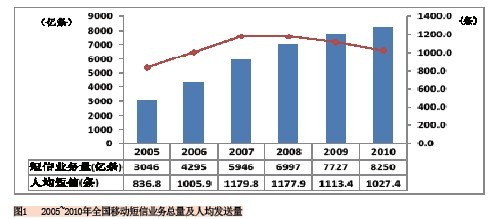 每當節(jié)假日期間,短信業(yè)務的“吸金”神話都會被人們津津樂道。例如2011年春節(jié)期間,短信業(yè)務又創(chuàng)新高:全國各類短信發(fā)送量累計達到260億條,比上年春節(jié)增長13%。從除夕和初一兩天的短信發(fā)送量來看,全國總量達到156億條,比上年同期增長20%,其中除夕當天,北京移動用戶短信發(fā)送量較上年同期增長12.86%,上海移動增長近20%,廣東移動增長23.30%。