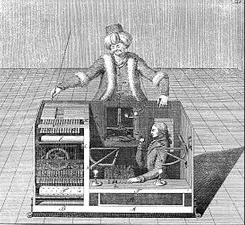 這個(gè)名字源自于臭名遠(yuǎn)揚(yáng)的能下象棋的“自動裝置”,它是匈牙利男爵沃爾夫?qū)ゑT·肯佩倫(Wolfgang Von Kempelen)1770年建造的。這個(gè)木制機(jī)器外形像一個(gè)坐在大機(jī)箱前的土耳其魔法師,它能自動而快速地下象棋,用復(fù)雜的齒輪和杠桿系統(tǒng)來移動棋子。在維也納皇宮的首次表演中,它就迅速擊敗了對手Cobenzl伯爵,讓在場的皇室成員看得十分高興。從此關(guān)于這個(gè)驚人聰明的機(jī)器人迅速聞名于世,于是肯佩倫帶著它在歐洲各地表演,擊敗了一系列著名的挑戰(zhàn)者,包括拿破侖和本杰明·富蘭克林。直到幾年之后,這個(gè)騙局才被揭穿。原來機(jī)箱里藏了一名象棋大師,他用一個(gè)磁鐵系統(tǒng)來跟蹤對手的舉動并移動自己的棋子,這個(gè)人實(shí)際是在模擬一種人工智能。(摘錄自 比特云 )