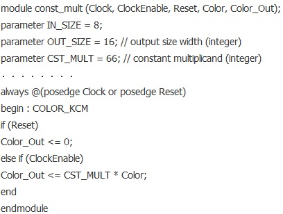用Verilog HDL編寫代碼,實(shí)現(xiàn)YUV到RGB的轉(zhuǎn)化。其中共包括3個(gè)模塊跟1個(gè)仿真激勵(lì)。在模塊const_mult中,主要實(shí)現(xiàn)乘法運(yùn)算,主要代碼如下: