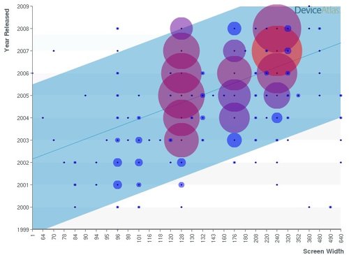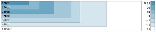 還有一點(diǎn),不到5%的設(shè)備寬度大于320個(gè)像素。但這一數(shù)字可能會(huì)在未來有所提升,目前已經(jīng)可以看到,小屏幕(128,176等)設(shè)備正逐漸被大屏幕(240+)設(shè)備所代替。下面的圖表給出了相關(guān)的分析。