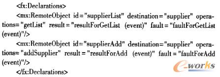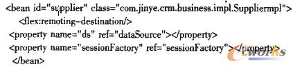 客戶層采用Flex4的Spark UI組件和ActionScript分別實現MVC模式的View和Control層,實現與系統(tǒng)用戶的交互,并通過Spring BalazeDs集成框架發(fā)布的Remote Object,實現與業(yè)務層對象的通訊,進而完成CRM業(yè)務處理。如下代碼為Flex中聲明Remote Object: