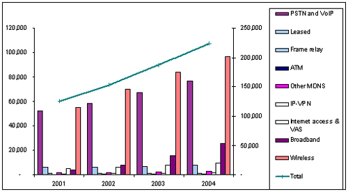 圖表:亞太地區(qū)電信市場(chǎng)2001-2004年收入狀況
