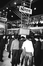 韓國(guó)移動(dòng)通信運(yùn)營(yíng)商SK電訊的展臺(tái)是整個(gè)展會(huì)上最熱鬧的地方之一,能歌善舞的韓國(guó)藝人吸引了很多觀眾駐足。在“為人類的移動(dòng)互聯(lián)通信, SK電訊與您攜手”的主題下,SK電訊展示了移動(dòng)增值及移動(dòng)互聯(lián)服務(wù)。