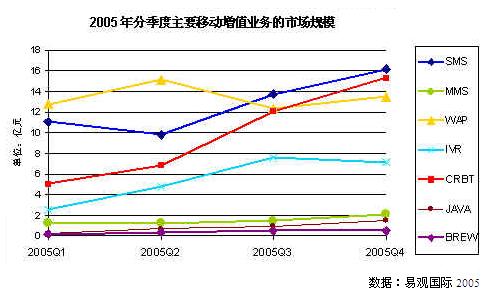 2005年分季度主要移動(dòng)增值業(yè)務(wù)的市場(chǎng)規(guī)模圖