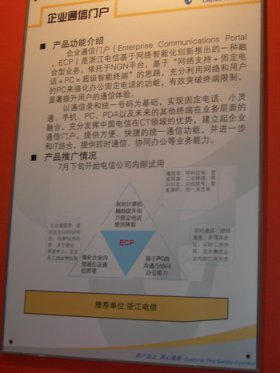 近日,中國電信在西安召開了上半年市場工作會議暨新產(chǎn)品展示專題研討會,在此次會議上,各省電信公司分別展示了自己面向市場開發(fā)的新型業(yè)務。其中,來自浙江電信的一種叫企業(yè)通信門戶ECP(Enterprise Communications Portal)的主推業(yè)務在展示過程中吸引了眾多目光,引起了其他與會代表的關注,被認為是中國電信拓展企業(yè)市場空間的最具潛力產(chǎn)品之一。