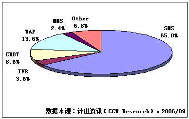 計世資訊(CCW Research)數(shù)據(jù)顯示,2006年第二季度,移動增值業(yè)務市場規(guī)模達到182億元人民幣,移動增值業(yè)務指依托移動通信網絡所提供的基本服務而開展的增值數(shù)據(jù)業(yè)務服務,市場規(guī)模包括移動運營商和服務提供商(SP)收入。其中SMS、IVR、CRBT、WAP和MMS市場規(guī)模分別為118.3、6.5、15.7、24.8和4.4億元人民幣,其他移動增值業(yè)務市場規(guī)模12.3億元人民幣,包括JAVA、BREW、移動定位等業(yè)務。