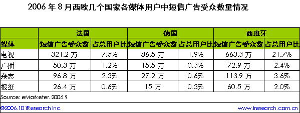 iResearch艾瑞市場咨詢根據eMarketer資料整理顯示,短信廣告在西歐國家大行其道,成百上千萬的移動用戶訂閱了廣告短信。西歐各國不同媒體訂閱廣告短信的用戶數(shù)不盡相同?傮w上來看,西班牙的短信廣告受眾最多,電視用戶中有21.7%人訂閱了短信廣告,數(shù)量達663.3萬。相比之下,法國電視用戶中的短信廣告受眾只有西班牙的1/2,德國則更少。