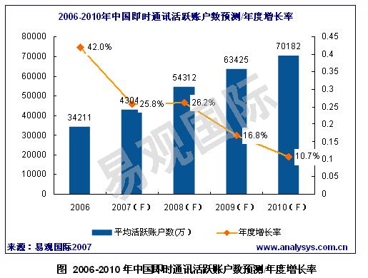 2007年中國(guó)即時(shí)通訊活躍賬戶數(shù)將達(dá)4.3億,未來(lái)3年增幅呈現(xiàn)下滑趨勢(shì)