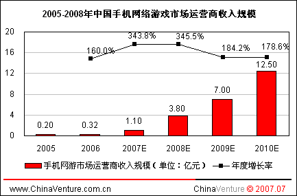 手機(jī)網(wǎng)游業(yè)務(wù)經(jīng)過近幾年培育,市場(chǎng)規(guī)模逐步擴(kuò)大。隨著用戶認(rèn)知度和普及率逐步提高,未來將成為游戲產(chǎn)業(yè)新的增長點(diǎn)。代表手機(jī)游戲未來發(fā)展方向的手機(jī)網(wǎng)游市場(chǎng)必將在2008年和2009年開始獲得風(fēng)險(xiǎn)投資商的廣泛關(guān)注。