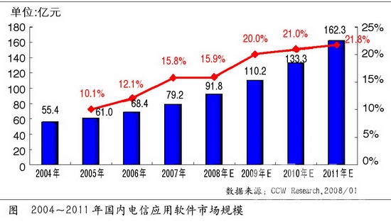 從計(jì)世資訊相關(guān)報(bào)告來(lái)看,2008年電信應(yīng)用軟件市場(chǎng)將出現(xiàn)以下特點(diǎn):