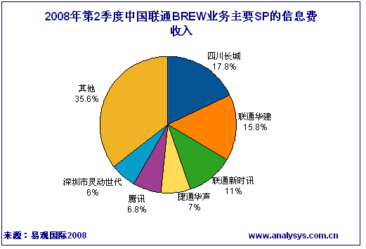 中國聯(lián)通BREW業(yè)務(wù)SP信息費(fèi)方面,四川長城、聯(lián)通華建、聯(lián)通新時(shí)訊位居前三名。四川長城信息(000748,股吧)費(fèi)收入為736.19萬元,市場占比17.8%。聯(lián)通華建和聯(lián)通新時(shí)迅信息費(fèi)收入分別為651.31萬和454.38萬,市場占比分別為15.8%和11%。值得一提的是騰訊QQ在BREW的"神奇寶典"業(yè)務(wù)中的推出,拉動(dòng)了下載量提升了其收入,致使騰訊BREW收入從第六名上升到第五名。