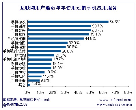 互聯(lián)網(wǎng)用戶近半年使用過的手機應用按比例排列依次是手機游戲、手機閱讀、手機搜索、手機瀏覽器、移動IM。其中移動互聯(lián)網(wǎng)用戶對手機游戲的使用率和互聯(lián)網(wǎng)用戶相當,達64.3%。具體如上圖: