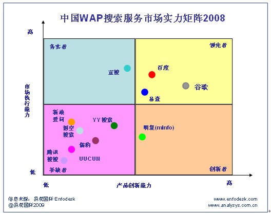 2008年WAP搜索市場中處于務實者象限的主要廠商是宜搜。2008年宜搜年收入占整個WAP搜索市場的36%。這主要歸因于宜搜在整個2008年在市場推廣和營銷方面投入了大量的人力以及資金投入。
