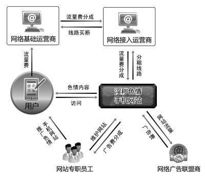 以包裝成彩鈴的標價2塊錢的淫穢色情視頻為例,用戶下載后,電信運營商就會從上網(wǎng)的手機賬號上扣掉2元錢,之后電信運營商就會按照與增值服務(wù)商的分成協(xié)議規(guī)定,按一定比例與增值服務(wù)商進行分成,比如按3:7進行分成,電信運營商就會將2元錢中的0.6元留為已有,將剩余的1.2元交給增值服務(wù)商,增值服務(wù)商再將1.2元中的一部分按比例分給內(nèi)容提供商。在這個過程中,電信運營商不僅獲得了增值服務(wù)分成的錢,而且由于提供了上網(wǎng)服務(wù),還會從手機用戶那里收取下載彩鈴所需要的數(shù)據(jù)流量費。