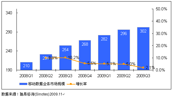 馳昂咨詢(Sinotes)發(fā)布的《2009年中國移動(dòng)數(shù)據(jù)業(yè)務(wù)市場監(jiān)測-第三季度》報(bào)告數(shù)據(jù)顯示,2009年Q3中國移動(dòng)數(shù)據(jù)業(yè)務(wù)市場規(guī)模達(dá)302億元,相比2009年Q2增長2.1%,表現(xiàn)出了平穩(wěn)增長的態(tài)勢。