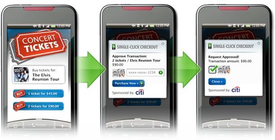 北京時(shí)間11月10日消息,據(jù)國(guó)外媒體報(bào)道,花旗銀行支持的Single-Click Checkout(singleclickcheckout.com)服務(wù)今天在舊金山的開(kāi)放移動(dòng)峰會(huì)(Open Mobile Summit)上推出,它是第一個(gè)為Android設(shè)計(jì)的信用卡結(jié)帳應(yīng)用程序。使用這項(xiàng)新服務(wù),商家可以接受來(lái)自任何移動(dòng)用戶的信用卡付款。