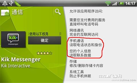 國內(nèi)外Kik類應(yīng)用也逐漸興起,騰迅最近也加入此陣營并推出其下產(chǎn)品微信。Kik類應(yīng)用主要以用戶手機(jī)中聯(lián)系人目錄為主要的關(guān)系抓取,只要其聯(lián)系人中裝入該客戶端,用戶無需特意添加即可開始類似短信的聊天。以KikMessenger為例,其中便涉及讀取用戶聯(lián)系人信息、電話狀態(tài)和身份等權(quán)限。