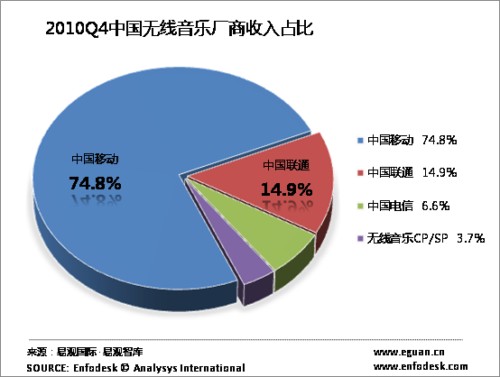 根據(jù)Enfodesk易觀智庫最新發(fā)布的數(shù)據(jù)顯示,2010年第4季度中國無線音樂收入保持穩(wěn)定的增長,達到74.13億元,環(huán)比增長4.58%。