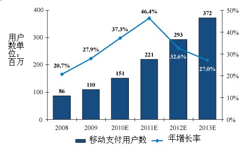 基于“中國計(jì)算機(jī)世界”的研究預(yù)測,中國移動(dòng)支付用戶在2009年底達(dá)到1.1億,預(yù)計(jì)將在2013年超過3倍。由于需求大幅提高,電信運(yùn)營商會(huì)繼續(xù)在每個(gè)省推出移動(dòng)支付解決方案網(wǎng)絡(luò)。反過來,也會(huì)刺激第三方平臺(tái)和供應(yīng)商的發(fā)展。
