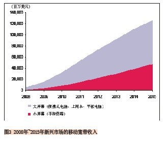由于新興市場(chǎng)的固網(wǎng)寬帶資源相對(duì)短缺,因此這些地方移動(dòng)寬帶替代固定寬帶的可能性將非常大。同時(shí),由于大屏幕移動(dòng)寬帶終端(便攜式電腦、上網(wǎng)本、平板電腦)一般比小屏幕終端的價(jià)格要高,因此我們認(rèn)為小屏幕終端將主導(dǎo)新興市場(chǎng),到2015年77%的移動(dòng)寬帶連接將基于小屏幕終端進(jìn)行(見(jiàn)圖2)。