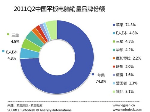 CTI論壇(ctiforum)7月21日消息(記者 楊佳林):根據(jù)易觀智庫最新數(shù)據(jù)顯示,在2011年第2季度蘋果iPad市場銷量份額環(huán)比下滑5.14%,至74.30%。其次是E人E本,占據(jù)了4.82%。三星位列第三。伴隨品牌平板電腦集體上市,以愛國者、藍(lán)魔為代表的消費(fèi)類電子廠商的平板電腦均收到一定影響,市場銷量和份額均有不同程度下降。
