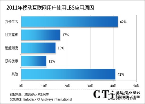 CTI論壇(ctiforum)8月26日消息(記者 張潔):根據(jù)易觀國(guó)際(Analysys international)最新調(diào)研顯示,42%的使用LBS用戶(hù)認(rèn)為使用應(yīng)用程序可以方便生活,17%的用戶(hù)認(rèn)為是社交需求,15%的用戶(hù)只是出于追趕潮流的目的,11%的用戶(hù)認(rèn)為使用LBS應(yīng)用程序可以獲得一定的優(yōu)惠。