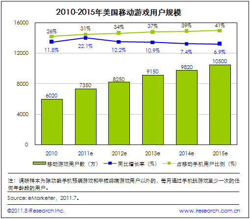 iResearch艾瑞咨詢根據(jù)eMarketer最新發(fā)布數(shù)據(jù)發(fā)現(xiàn),2010年美國(guó)移動(dòng)游戲用戶規(guī)模為6020萬(wàn)人,同比增長(zhǎng)11.8%,占美國(guó)移動(dòng)手機(jī)用戶比例為26%;預(yù)計(jì)未來五年內(nèi),用戶規(guī)模將保持持續(xù)增長(zhǎng)勢(shì)態(tài),2011年將出現(xiàn)一個(gè)較高的增長(zhǎng)點(diǎn),移動(dòng)游戲用戶數(shù)將達(dá)到7350萬(wàn)人,同比增長(zhǎng)22.1%,在移動(dòng)手機(jī)用戶中的滲透率達(dá)31%;之后增長(zhǎng)將逐漸趨緩,到2015年用戶規(guī)模將突破一億,達(dá)到1.05億,同比增長(zhǎng)率降為6.9%,滲透率達(dá)41%。