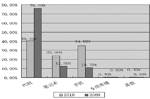 以手機(jī)為閱讀載體的比例從2009年的10.7%激增到2010年的34.8%。相比之下,PC機(jī)閱讀則出現(xiàn)了大幅度地滑落,從2009年的76.1%下降到2010年的40.4%。可見(jiàn),大部分通過(guò)PC機(jī)閱讀的讀者更加傾向或習(xí)慣于手機(jī)閱讀。