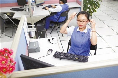 昨日,中國(guó)聯(lián)通二區(qū)分公司內(nèi),接線員郭婷玉在為打進(jìn)電話的市民處理完預(yù)約掛號(hào)服務(wù)后摘下耳機(jī)。