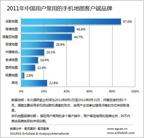 CTI論壇(ctiforum)11月25日消息(記者 潘婷婷): 據(jù)EnfoDesk易觀智庫(kù)最新發(fā)布的《2011中國(guó)手機(jī)地圖導(dǎo)航用戶調(diào)研報(bào)告》顯示,谷歌地圖、高德地圖及諾基亞地圖分別以87.6%、46.8%及44.7%的份額,占據(jù)2011年用戶最常用的手機(jī)地圖客戶端品牌份額(指在用戶常用的多個(gè)客戶端中,用戶首選使用的品牌比例,并不代表該品牌實(shí)際的市場(chǎng)份額,實(shí)際市場(chǎng)份額參見(jiàn)《2011年第3季度中國(guó)手機(jī)地圖客戶端市場(chǎng)監(jiān)測(cè)報(bào)告》)前三名的位置。