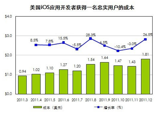 國(guó)際著名APP市場(chǎng)營(yíng)銷組織Fiksu最新的研究數(shù)據(jù)或許能出答案。2011年12月iOS應(yīng)用開發(fā)者獲得一名忠實(shí)用戶的成本達(dá)到1.81美元,創(chuàng)下歷史新高。而在2011年第一季度,獲得一名用戶的平均成本為0.94美元,一年間單個(gè)用戶成本翻了一倍。當(dāng)用戶對(duì)蘋果商店里花樣繁多的游戲開始麻木,就需要借助有針對(duì)性的推廣策略和強(qiáng)大的執(zhí)行,讓產(chǎn)品脫穎而出。如今忠實(shí)用戶成本的提高,使得幾乎所有開發(fā)者乃至小團(tuán)隊(duì)都畏懼前期的市場(chǎng)推廣,大中型開發(fā)公司可利用自身的資源循環(huán)造血拉動(dòng)用戶,越是小的開發(fā)團(tuán)隊(duì)成功的幾率就越渺茫,而被吞并的可能性則大增。