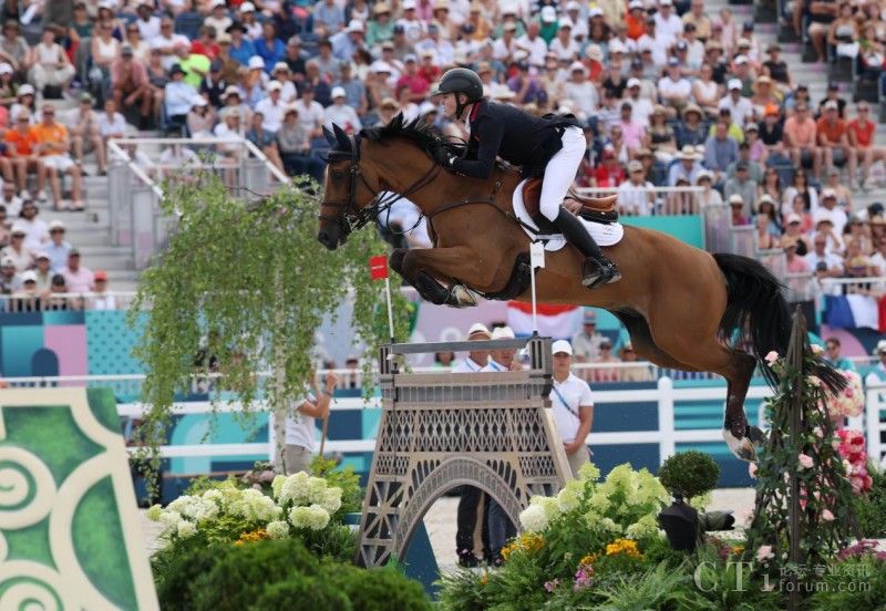 8月2日,英國隊選手查爾斯在比賽中。當(dāng)日,在巴黎奧運會馬術(shù)團(tuán)體場地障礙大獎賽決賽中,英國隊奪得金牌。新華社記者 楊磊 攝
