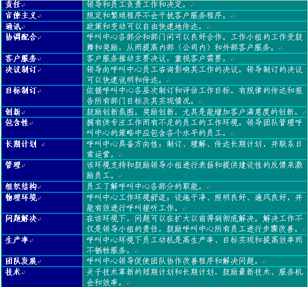 根據(jù)呼叫中心的具體需要,還可以包括許多其他要素。建議在制訂員工滿意度調(diào)查表時(shí)結(jié)合組織人員關(guān)系,組織管理、收集和報(bào)告結(jié)果和趨勢。這有助于員工確信調(diào)查過程、調(diào)查結(jié)果及其對今后提高的影響。