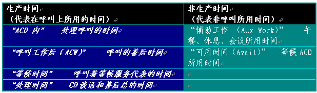 如果工作狀態(tài)最佳,代表的工作目標(biāo)為80%的時(shí)間用在呼叫上,其余為非生產(chǎn)時(shí)間。主管運(yùn)用ACD報(bào)告結(jié)合第一手調(diào)查資料考察這些工作所用的時(shí)間。