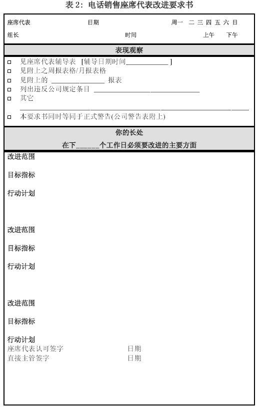 。。這里所列的兩張輔導(dǎo)表應(yīng)該是主管、質(zhì)檢與輔導(dǎo)師最常見的工具。那種無(wú)法對(duì)通話內(nèi)容進(jìn)行具體、詳盡分析,或者輔導(dǎo)人自己也定義不清, 不能給出示范與明確改進(jìn)方向的管理絕對(duì)不是專業(yè)的管理。在這類輔導(dǎo)表之外,可以根據(jù)通話的評(píng)價(jià)和其它一些紀(jì)律觀察,設(shè)計(jì)一種“改進(jìn)要求表”,將根據(jù)表現(xiàn)觀察后制定的改進(jìn)要求詳細(xì)列出。如果公司有書面警告一類的程序要求,也可揉合進(jìn)改進(jìn)要求書。