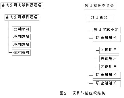 這支隊伍既有企業(yè)高級管理層所組成的指導(dǎo)委員會和咨詢公司人員,也有來自信息部門的技術(shù)人員和相應(yīng)職能部門的熟悉企業(yè)流程的業(yè)務(wù)人員所組成的實施小組和職能小組。項目隊伍組織結(jié)構(gòu)如圖2所示。