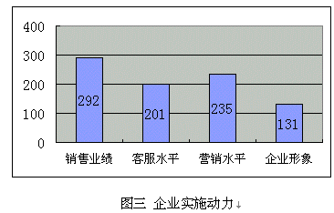(d)提升企業(yè)形象:很多受訪企業(yè)特別是服務(wù)業(yè),已經(jīng)建立客戶忠誠度放在了很重要的位置,但比較其它幾個直接動因,比例偏低,這也似乎說明"以客戶為中心"的觀念還沒有"以利潤為中心"強(qiáng)烈。
