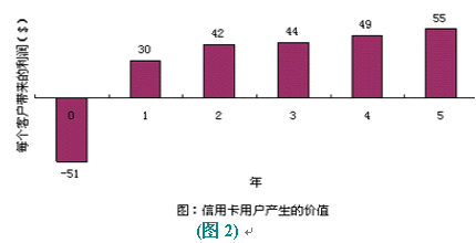 以信用卡服務(wù)為例,爭取一個新的用戶平均要51美圓,用于廣告、推銷和開戶等開支。用戶開始時花錢很少,但為公司帶來一定的利潤。但如果用戶繼續(xù)使用到第二年,就會為公司帶來更多的經(jīng)濟(jì)效益,因為公司與客戶之間的信任和客戶對公司的滿意,致使客戶更多地通過信用卡消費(fèi)。(圖:"信用卡用戶產(chǎn)生的價值")用戶貢獻(xiàn)在增加,公司的運(yùn)作費(fèi)用卻在不斷減低。信用卡公司可以不斷減少對客戶信用的審核時間。保持長期的客戶關(guān)系,還可以減少廣告支出,客戶本身就是一個免費(fèi)的廣告資源。很多人在消費(fèi)前喜歡聽取朋友的意見,覺得比廣告更可信。