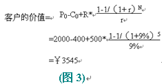 假設(shè)客戶與公司保持交易時間:N=5年;公司最初吸引每個客戶的成本(營銷費(fèi)用): C0=¥400;客戶第一次購買的產(chǎn)品價格:P0=¥2000;公司期望每年從每個客戶處增加的收入:R=¥500;利率(一般指貸款利率): r =9%;那么客戶的價值等于:客戶初次購買產(chǎn)品和以后幾年每年消費(fèi)價值的折現(xiàn)之和,減營銷成本,即: