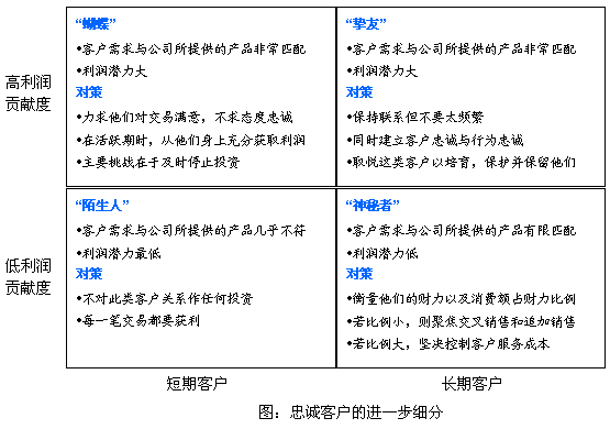 CRM廠商和業(yè)界普遍認(rèn)為:只要贏得了客戶的忠誠,企業(yè)將"財源滾滾";因此企業(yè)在培養(yǎng)客戶忠誠方面的開支在逐步上升。因為從表面上看來,客戶滿意度、客戶忠誠度和客戶保留度越高,客戶利潤貢獻(xiàn)度就大。但事實并不如他們所愿,《哈佛商業(yè)評論》最新的論文,研究表明:客戶滿意度、客戶忠誠度與客戶利潤貢獻(xiàn)度的關(guān)聯(lián)程度比預(yù)期的要小得多。企業(yè)應(yīng)當(dāng)對忠誠客戶再進(jìn)行細(xì)分,然后在更細(xì)化的客戶基礎(chǔ)上對其進(jìn)行分類管理,并采取相應(yīng)的對策。在論文中,作者根據(jù)利潤貢獻(xiàn)度大小與客戶的短長期兩個維度,將忠誠客戶進(jìn)行了深層次細(xì)分。主要分成四類:"蝴蝶"、"摯友"、"陌生人"、"神秘者"。企業(yè)應(yīng)該根據(jù)每一類的情況采取相應(yīng)的對策。管理那些能使企業(yè)盈利但不忠誠的客戶--"蝴蝶"--的關(guān)鍵是,在他們購物時盡可能地從他們身上獲利。對那些既能帶來利潤又忠誠的客戶--"摯友",細(xì)心呵護(hù)他們則更為恰當(dāng)。至于那些忠誠但不能帶來利潤的客戶--"藤壺",你需要做的是確定他們是否有增加消費的潛力。最后,對于"陌生人"--那些既不忠誠又沒有利潤可賺的客戶,答案當(dāng)然很簡單:早點認(rèn)出他們,不對他們做任何投資。
