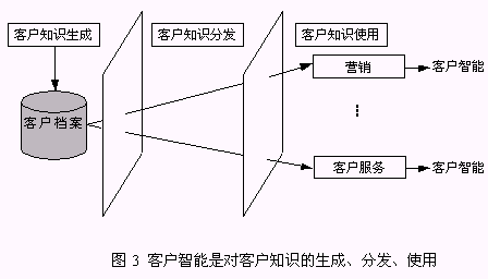 客戶知識(shí)是人們通過實(shí)踐認(rèn)識(shí)到的、與客戶有關(guān)的規(guī)律性,而客戶智能是獲得客戶知識(shí)并使用客戶知識(shí)求解問題的能力?蛻糁悄苁菍(duì)企業(yè)戰(zhàn)略決策真正有價(jià)值的事物和行動(dòng)?蛻糁悄懿粌H包括了客戶知識(shí)的生成,而且更強(qiáng)調(diào)了客戶知識(shí)在企業(yè)中的分發(fā)、使用,直到產(chǎn)生客戶智能。所以,客戶智能是對(duì)客戶知識(shí)的生成、分發(fā)和使用(圖3)。