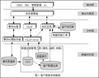圖1描述了一個典型的客戶智能系統(tǒng)體系結(jié)構(gòu)。面向特定的應(yīng)用,客戶智能的體系結(jié)構(gòu)會有所改進(jìn),以使系統(tǒng)與具體的業(yè)務(wù)相符。例如:建立何種數(shù)據(jù)存貯和數(shù)據(jù)模型能很好地支持主題,支持客戶數(shù)據(jù)分析和客戶知識發(fā)現(xiàn)的需要;選擇何種決策分析工具;將發(fā)現(xiàn)的客戶知識通過何種接口傳送給相應(yīng)的用戶等等,都需要實(shí)際情況結(jié)合起來考慮。