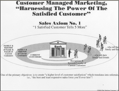 客戶滿意的影響范圍如下圖所示,客戶滿意的力量從里向外逐層波及,以現(xiàn)有客戶的滿意為基礎(chǔ),然后通過(guò)推薦傳遞到新的客戶。其傳遞路徑為“現(xiàn)有客戶”——“現(xiàn)有客戶的家人及朋友”——“現(xiàn)有客戶的家人及朋友的家人及朋友”…一直延伸下去最終使企業(yè)的營(yíng)銷策略大獲成功,這一切的動(dòng)力都來(lái)自于“更高的客戶滿意度引起的客戶行為”。這個(gè)營(yíng)銷公式要取得長(zhǎng)期成功沒(méi)有任何秘密,它失敗的風(fēng)險(xiǎn)被最小化,因?yàn)樗揽康氖强蛻舴e極的行動(dòng)和表現(xiàn),以久經(jīng)考驗(yàn)的銷售公理——“1個(gè)滿意的客戶會(huì)把自己的愉快經(jīng)歷告訴5個(gè)以上的人。”——為基礎(chǔ)。