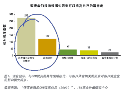 IBM商業(yè)價(jià)值研究中心的一項(xiàng)研究結(jié)果印證了筆者的設(shè)想。IBM 對(duì)美國(guó)10家零售商的消費(fèi)群進(jìn)行了調(diào)查,其中包括5家表現(xiàn)較好的(過去3年中在店面單位面積銷售和凈收入的增長(zhǎng)方面做得很好)和5家表現(xiàn)較差的(業(yè)績(jī)持平或出現(xiàn)下滑)。調(diào)查發(fā)現(xiàn),領(lǐng)先的零售商能夠同時(shí)有效使用關(guān)鍵的滿意度推動(dòng)因素和關(guān)系要素,為消費(fèi)者提供最佳的“總體體驗(yàn)”,即一家公司(或一個(gè)品牌)有形、無(wú)形地給客戶留下的總體印象。該項(xiàng)調(diào)查的統(tǒng)計(jì)分析結(jié)果發(fā)現(xiàn)了5組滿意度推動(dòng)因素: