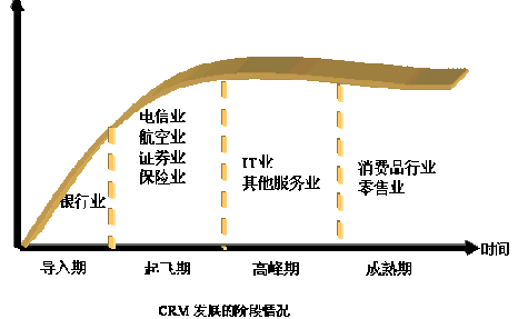從圖中我們可以大致看出CRM的發(fā)展情況。保險(xiǎn),電信行業(yè)對(duì)這比較重視,而且得到了一定的應(yīng)用。但是在其他行業(yè)中的發(fā)展仍然比較緩慢。面對(duì)中國(guó)的龐大市場(chǎng),從CRM的發(fā)展中不難看出:會(huì)隨著經(jīng)濟(jì)的發(fā)展得到長(zhǎng)足的發(fā)展。隨著經(jīng)歷早期客戶是蒙昧期,后來(lái)是觀察期,現(xiàn)在是選擇期,CRM市場(chǎng)可能出現(xiàn)爆炸性的增長(zhǎng)。CRM本身是很好的,發(fā)展到一定階段,引導(dǎo)期已經(jīng)過(guò)了,又會(huì)發(fā)展起來(lái)。
